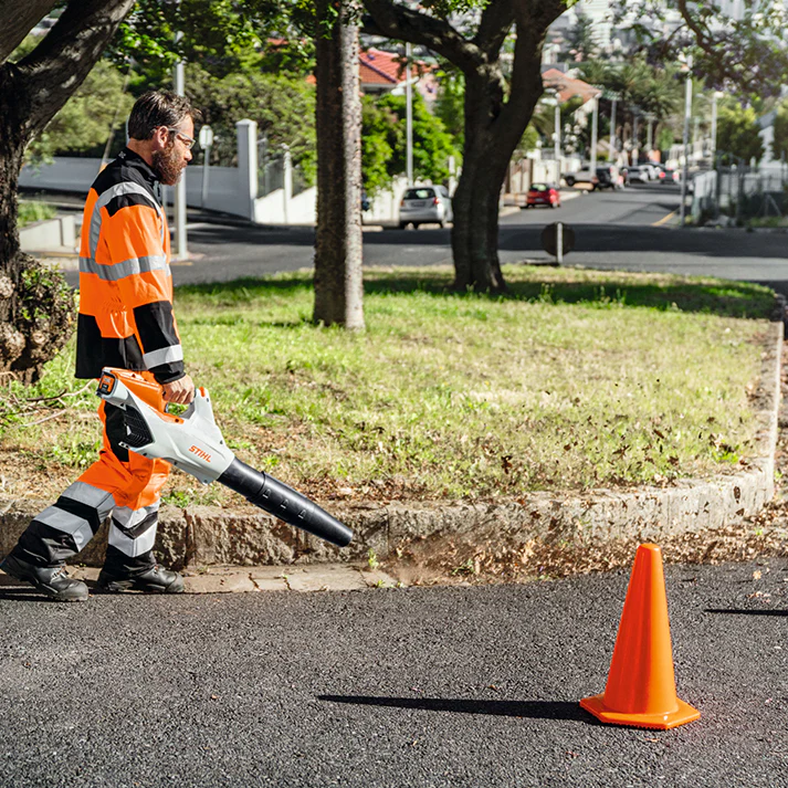 Experience the power and convenience of our advanced cordless blower, designed for professional use in expansive urban environments.
